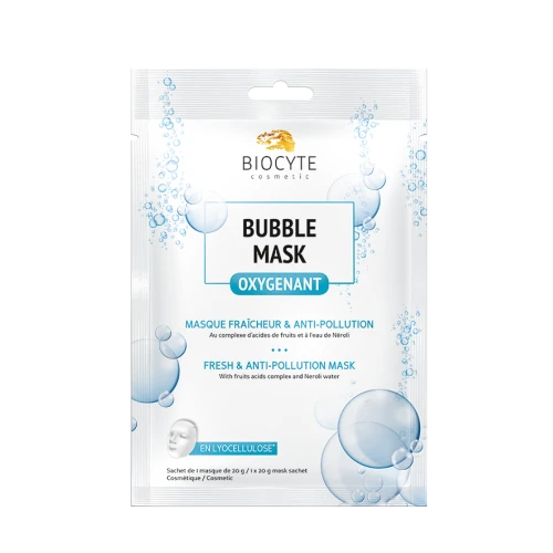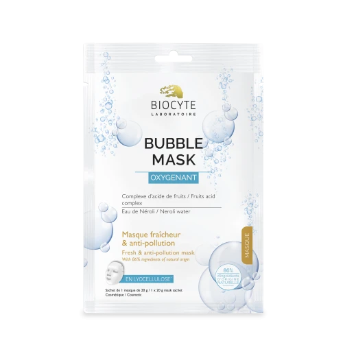 BIOCYTE BUBBLE MASK est un masque pour le visage pour les personnes à la peau ternie et fatiguée qui recherchent un soin exfoliant doux pour leur peau. Notre peau subit perpétuellement les effets néfastes de l’environnement comme le soleil ou la pollution. A terme, cela empêche la peau de respirer correctement, elle perd en vitalité et se ternie. BUBBLE MASK est formulé à base d’un complexe d’acides de fruits pour détoxifier la peau grâce à un peeling doux et d’eau de néroli, une fleur connue pour ses propriétés apaisantes. Ces actifs sont contenus dans un support en lyocellulose, une fibre naturelle à la texture extrêmement douce qui offre une excellente adhésion à la peau, dans le respect des peaux sensibles.