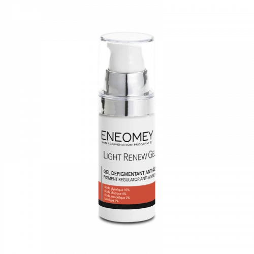 Grâce à une combinaison unique de 3 acides (Acide glycolique, acide phytique et acide mandélique) et du peptide breveté Lumilight, LIGHT RENEW GEL régule la pigmentation de la peau, éclaircit les taches et unifie le teint. Ce gel dépigmentant agit ainsi sur toutes les taches, aux différents stades de leur développement.