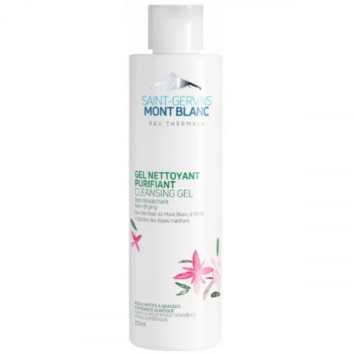 Saint-Gervais Mont Blanc Gel Nettoyant Purifiant 200 ml est un soin non desséchant dédié aux peaux mixtes à grasses et à tendance acnéique. Composé d’Epilobe des Alpes matifiant, il nettoie en douceur les impuretés cutanées et les cellules mortes. Sans savon, il n’agresse pas la peau. Elle est visiblement plus nette, fraîche, matifiée, sans tirailler.