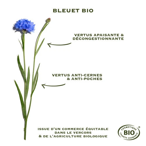 Il est concentré en eau de bleuet centaurea Bio, plante médicinale connue pour son action décongestionnante comparable à la vitamine C, en extrait d’arbre à soie et en glycérine végétale sélectionnés pour leurs vertus anti-rides et hautement hydratantes agissant sur le lissage du regard. Dès l’application, le contour de l’œil est hydraté. Jour après jour, l’ensemble de la zone regard paraît reposée et illuminée. Le contour de l’œil est raffermi et restructuré. Les rides sont visiblement lissées et les cernes et les poches diminuent.