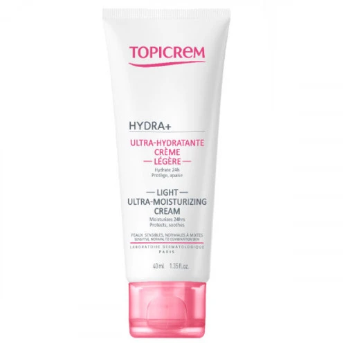 Topicrem Ultra-Hydratante Crème Légère 40 ml à la texture fraîche est une crème recommandée pour hydrater, protéger et apaiser les peaux sensibles, normales à mixtes. Son cocktail d’actifs physiologiquement présent dans la peau (urée, glycérine), associé à un lipide biomimétique la protège et l’apaise. Hydrate intensément 24h. Texture fraiche. La crème ultra hydratante légère Topicrem permet de protéger et d’apaiser les peaux sensibles, normales à mixtes.