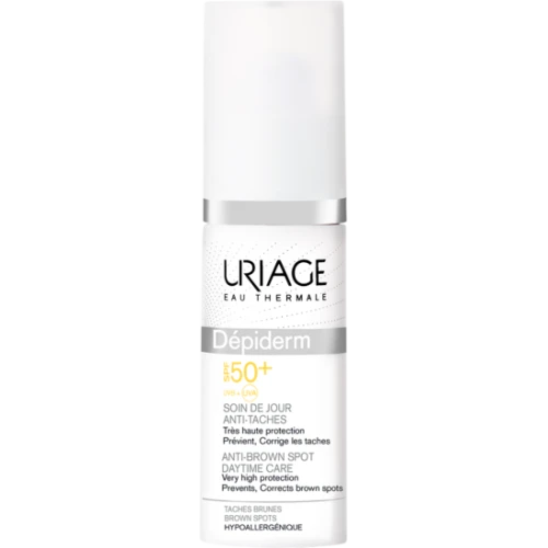 Uriage DĂ©piderm Soin de Jour Anti-Taches SPF 50+ 30 ml est un soin de très haute protection qui aide Ă prĂ©venir de l’apparition des taches et protège les zones traitĂ©es par acte dermatologique.Ce soin contient un complexe Cx qui associe des actifs anti-taches, apaisants et anti-oxydants, ce qui homogĂ©nĂ©ise le teint et attĂ©nue les dĂ©fauts de pigmentation. Sa formule contient Ă©galement de l’Eau Thermale d’Uriage qui hydrate la peau et prĂ©serve la barrière cutanĂ©e.